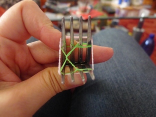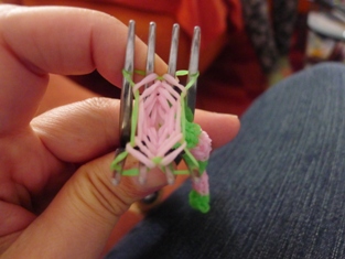 Trošku väčšie gumičky môžeme pliesť aj na vidličke. Pomocou háčika alebo aj len tak prstami prehadzujeme gumičky zo zuba na iný zub vidličky.