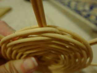 Môžeme pokračovať vo zväčšovaní dna tak, že si zasunieme nový dlhý prút vedľa ukončeného a prvý okruh pokračujeme ako sme plietli doteraz a v ďalšom si rozdelíme zase dvojice osnovných prútov a pletieme v pomere jeden hore, dva dole alebo jeden dole a dva hore. A zase ukončíme pletenie tam, kde sme začali pliesť.