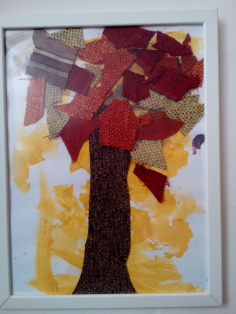 Na farebný výkres nalepíme z plsti vystrihnutý kmeň stromu. Môžeme použiť aj inú nepáravú látk a nalepiť na biely papier, len zafarbený kde tu na zeleno ako tráva v lete či na žlto ako tráva na jeseň . Listy alebo korunu vystrihneme z látky, ktorú sme predtým naškrobili a nechali vyschnúť. Listy alebo korunu prilepíme na konáre. Zarámujeme.