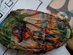 Odrezaný kus gulatiny potrieme vrstvou Duvilaxu. Necháme zaschnúť. Prikryjeme vrstvou servítky a cez papier na pečenie prežehlíme. Potom servítku pozorne obstrihneme. Drevený obrázok môžeme zavesiť na stenu, položiť na poličku či len tak na stôl.