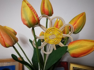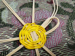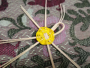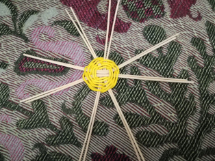 Kvietok sme urobili aj vo verzii tak, že vnútro sme omotávali žltým tenkým prútom hrúbky 1,5 mm, no teraz sme omotávali technikou Silvia. Vypletáme dno košíka technikou Silvia (dobre-napady.sk)
