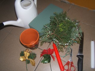 Potrebujeme: hlinený kvetináč (ak má zo spodu dierku, potom aj misku), akrylovú farbu, servítku s vianočným motívom, lepidlo na servítkovú techniku, hmotu na napichávanie rastlín, vetvičky z tuje, sviečku, vianočné ozdoby