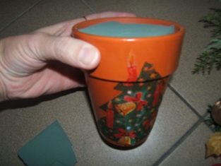 Najprv si natrieme kvetináč akrylovou farbou. Necháme dobre vyschnúť. Vystrihneme si vianočné motívy zo servítky a nalepíme na kvetináč. Necháme dobre vyschnúť.