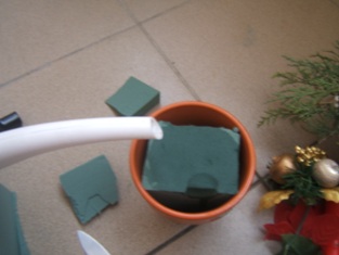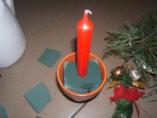 Do vnútra kvetináča vložíme hmotu na napichávanie rastlín. Obrežeme ju tak, aby nám vypchala vnútro. Vpichneme sviečku. Okolo napicháme vetvičky a nakoniec pridáme ozdoby podľa svojej predstavy.