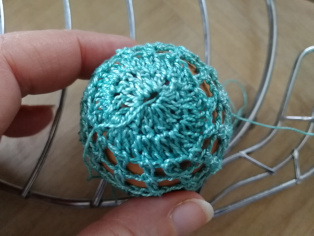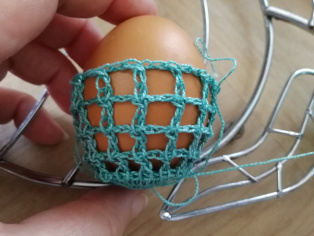 Ďalšie tri okruhy urobíme tak, že nad dlhým stĺpikom urobíme dlhý stĺpik a nad retiazkovým očkom urobíme dve retiazkové očká. Okruhy uzavrieme pevným okom. Do háčkovania vložíme vyfúknuté vajíčko. ďalej háčkujeme už s vloženým vajíčkom.