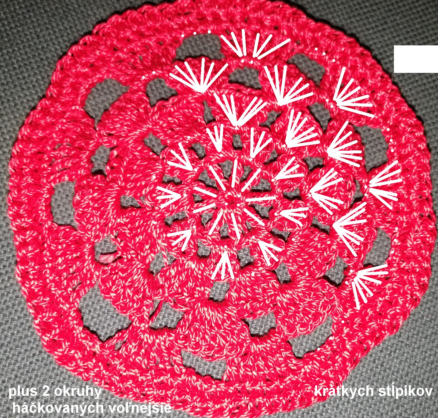 Urobíme si retiazku z 20 očiek. Nad ňou uháčkujeme 18 - 22 riadkov krátkych stĺpikov. Potom háčkujeme dookola krátke stĺpiky. pričom v rožnom očku vždy dva. My sme nakoniec urobili 22 okruhov, pričom sme po uzatvorení okruhu vždy otočili háčkovanie, aby sa menej vlnilo.