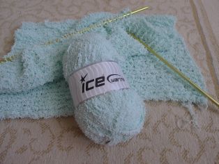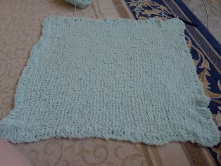 Pletieme ihlicami č. 6. Nahodíme si 52 očiek a pletieme asi 150 radov obrátenými očkami. Potom pletenie uzavrieme a háčik č. 6 dlhými stĺpikmi obháčkujeme obvod pleteného obdĺžnika. Ak urobíte v každom druhom očku po dva dlhé stĺpiky, dostanete pekný volánový okraj.