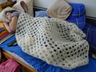 Háčkujeme háčikom č. 8 chlpatú bavlnu hrúbky na háčik č. 6 - 7. Snažíme sa háčkovať voľne, aby bola deka padavá a ľahká. Perieme ju potom pri 40°C a odstreďujeme pri otáčkach 600. Sušíme preloženú na štyri vo vodorovnej polohe.