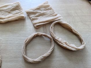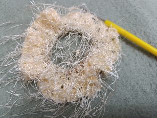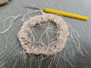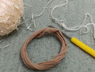 Nastriháme si silónové pančuchy a stočíme do "gumičky" do vlasov. Pripravíme si priadzu a háčik. Budeme háčkovať dvakrátnahodené dlhé stĺpiky počas všetkých troch okruhov.