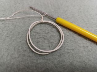 - Okruh uháčkujeme len stĺpiky. Neháčkujeme ich veľmi husto. Nesnažíme sa gumičku naťahovať. Na konci okruh spojíme pevným okom, v ktorom urobíme 4 retiazkové očká. Otočíme háčkovanie dolu hlavou.
