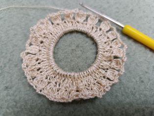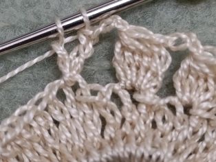- V jednom retiazkovom očku z predošlého okruhu urobíme 6 stĺpikov, nad stĺpikmi z predošlého okruhu urobíme 2 retiazkové očká. Takto háčkujeme celý okruh, ktorý ukončíme pevným okom.