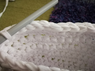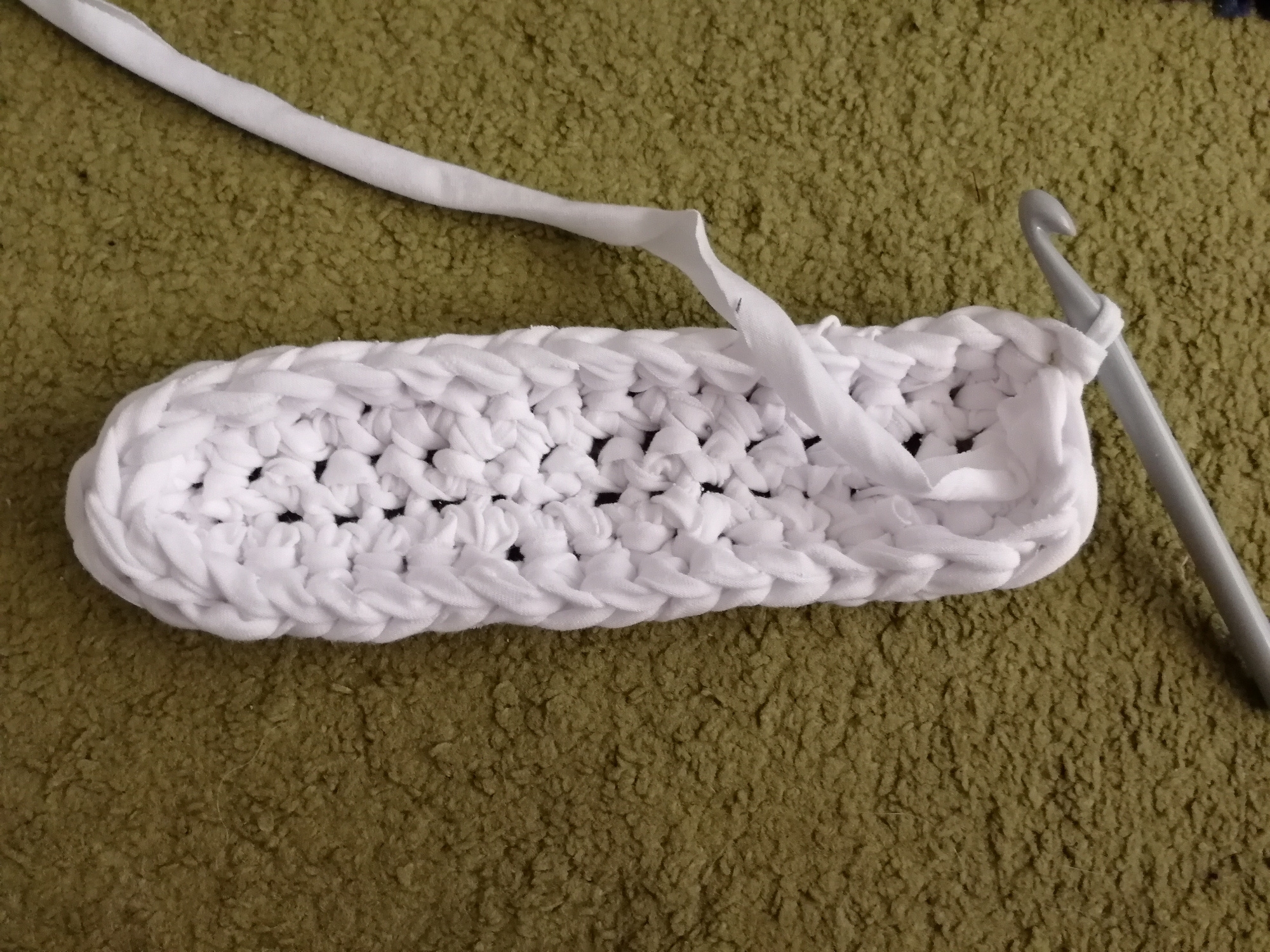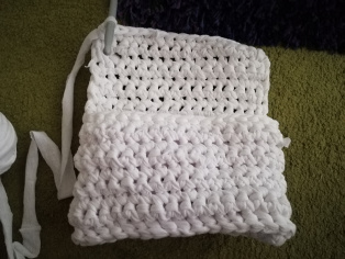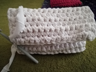 Ani dnes tomu nie je inak. Nastrihali sme tri rovnaké tričká veľkosti XL na vlnu hrúbky 1 cm. Také firemné, čo sme našli ako zánovné uložené v poličke. Háčkovali sme háčikom č. 9.