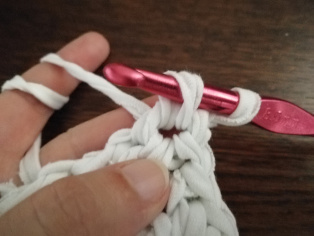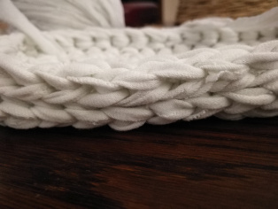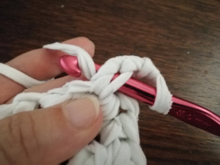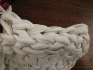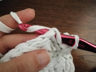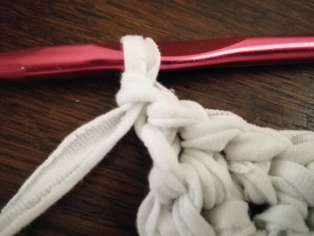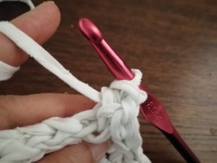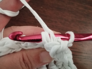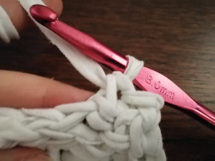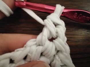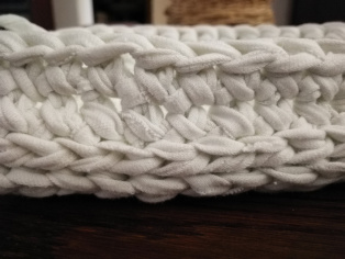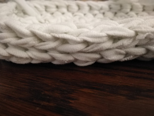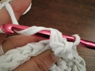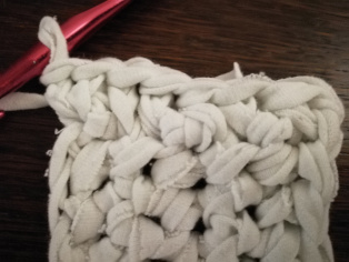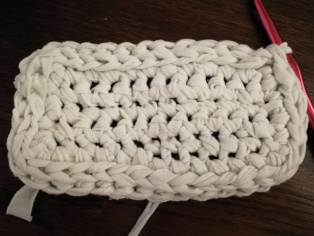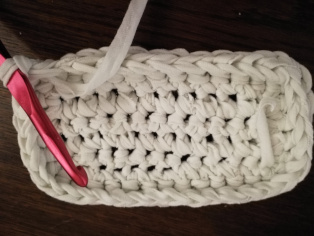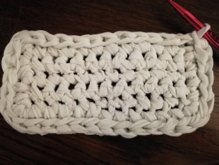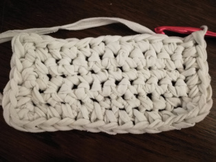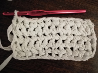 Háčkujeme z trička nastrihaného na pásy široké 1 cm háčikom č. 8. Urobíme si nad 12-timi retiazkovými očkami obdĺžnik pomocou krátkych stĺpikov. Tento obdĺžnik teraz obháčkujeme po obvode - dookola krátkymi stĺpikmi, aby sme ho vyrovnali.