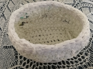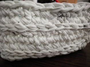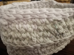 Háčkujeme košík do kúpeľne na drobnosti. Háčkujeme z nastrihaných tričiek. Už som si na takéto košíky zvykla. Sú super vec. V skrini ich máme na ponožky a spodné prádlo, v kúpeľni na drobnosti, na chodbe na poličke na kľúče, na balkóne mám v nich zemiaky. Nie, neurobila som ich všetky v jeden rok.