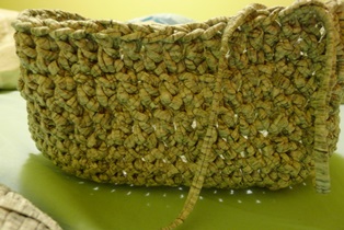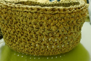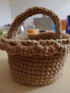 Použili sme pevnejšiu bavlnu a háčik č. 4. Na tomto košíku je dno uháčkované do kruhu krátkymi stĺpikmi. Ukončené je reliéfnym stĺpikom. Boky košíka sú končené vlnkami. Rúčka je uháčkovaná z retiazky a dvoch radov polodlhých stĺpikov a nakoniec prišitá ku košíku.