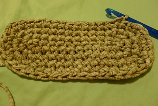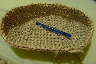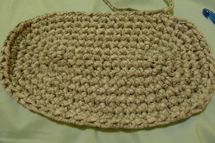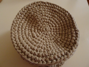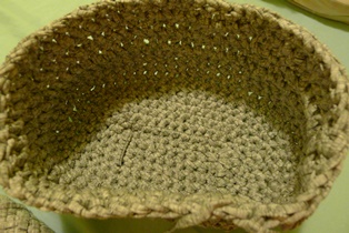 Dno je háčkované okolo prvotnej retiazky - v našom prípade z 12 očiek. Keďže tričkovina nie je veľmi rovnomerne vždy nastrihaná, je potrebné si dávať väčší pozor a lepšie počítať očká pri háčkovaní, aby sme udržali dno v danom tvare. Dno nie je v tomto prípade ukončené reliéfnym stĺpikom, len sme proste prestali pridávať očká a plietli do kruhu.