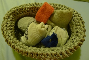 Košík je háčkovaný háčikom č. 8 z nastrihaného trička na asi 1,5 cm široké pásy.