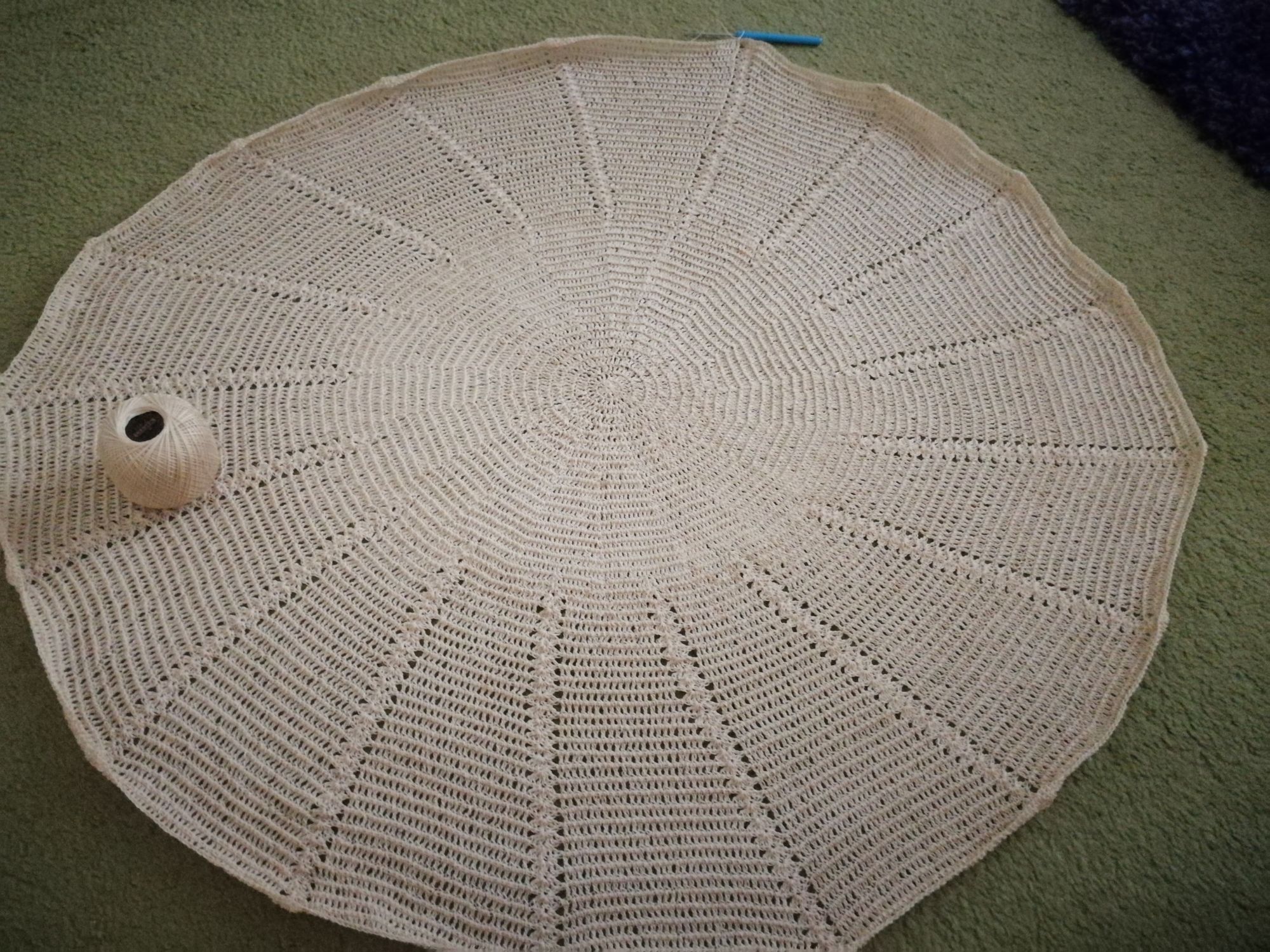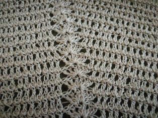 Ak začnete robiť vejárikovú vzorku skôr - ako na nasledujúcej fotografii, môže obrus či menšia dečka vyzerať aj takto. Takto urobenú odporúčam radšej menšiu podložku napríklad pod poháre či šálky alebo menšiu dečku na stôl, ktorý je prikrytý potom sklom.