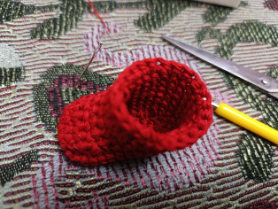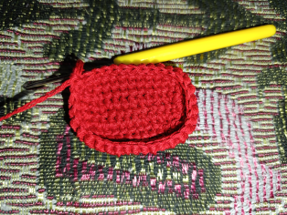Následne obháčkujme obdĺžnik krátkymi stĺpikmi. Urobíme takto 4 - 5 okruhov. Okruhy vždy uzatvárame pevným okom. Nasledujúci okruh uháčkujeme len kúsok za polovicu a otočíme sa. Háčkujeme 5 - 6 radov po 6 - 7 očiek. Tieto rady majú tvoriť prednú časť topánky.