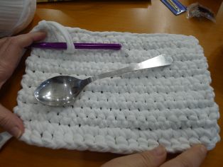 Nad retiazkou z 20 očiek si uháčkujeme 15 radov krátkych stĺpikov. Potom obháčkujeme celý obdĺžnik jedným radom krátkych stĺpikov, pričom v rožnom očku urobíme dva krátke stĺpiky. Ďalší rad pokračujeme reliéfnym stĺpikom, aby "príborník" dostal krajší tvar. Potom háčkujeme 4 rady krátkych stĺpikov a nakoniec háčkovanie uzavrieme radom zo spevňujúcich očiek.