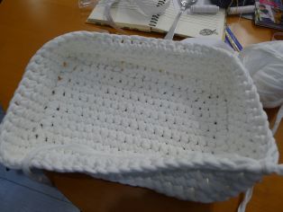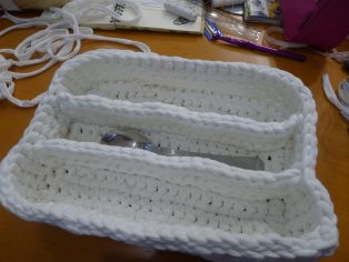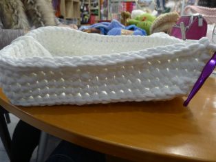 Aj takýto košík na príbory či iné košíky alebo a pletenie a háčkovanie čiapok či baretiek vás naučí na svojich kurzoch pani Bibiána. Informujte sa o kurzoch na www.opletacky.sk