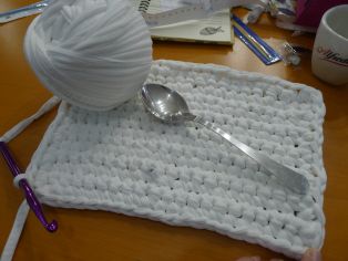 Potrebujeme nastrihanú tričkovinu na šírku asi 2 - 2,2 cm a háčik č. 9. Tá naša bola pružnejšia a tak sa aj viac na začiatku krútila.