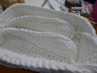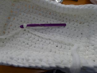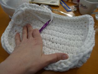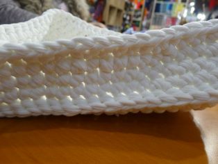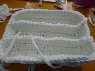 Dovnútra uháčkujeme priečky krátkymi stĺpikmi, ktoré po krajoch prišijeme.