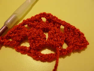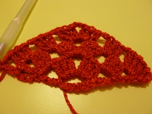 2. rad (otočíme háčkovanie): Urobíme 5 retiazkových očiek, 1 krátky stĺpik v prvom očku, 1 retiazkové očko, potom 3 dlhé stĺpiky v najbližšom retiazkovom očku, 1 retiazkové očko, 3 dlhé stĺpiky v 2 retiazkových očkách, 2 retiazkové očká, 3 dlhé stĺpiky v tých istých dvoch retiazkových očkách, 1 retiazkové očko, 3 dlhé stĺpiky v najbližšom retiazkovom očku, 1 retiazkové očko, 1 dlhý stĺpik v poslednom očku.