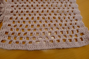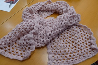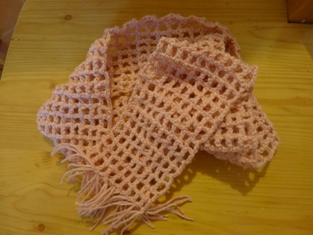 Urobíme si retiazku z 20 očiek háčikom č. 3. A nad retiazkou urobíme asi meter dlhý šál zo štvorčekovej alebo okienkovej vzorky. Nakoniec zauzlíme menšie strapce do každého okienka.