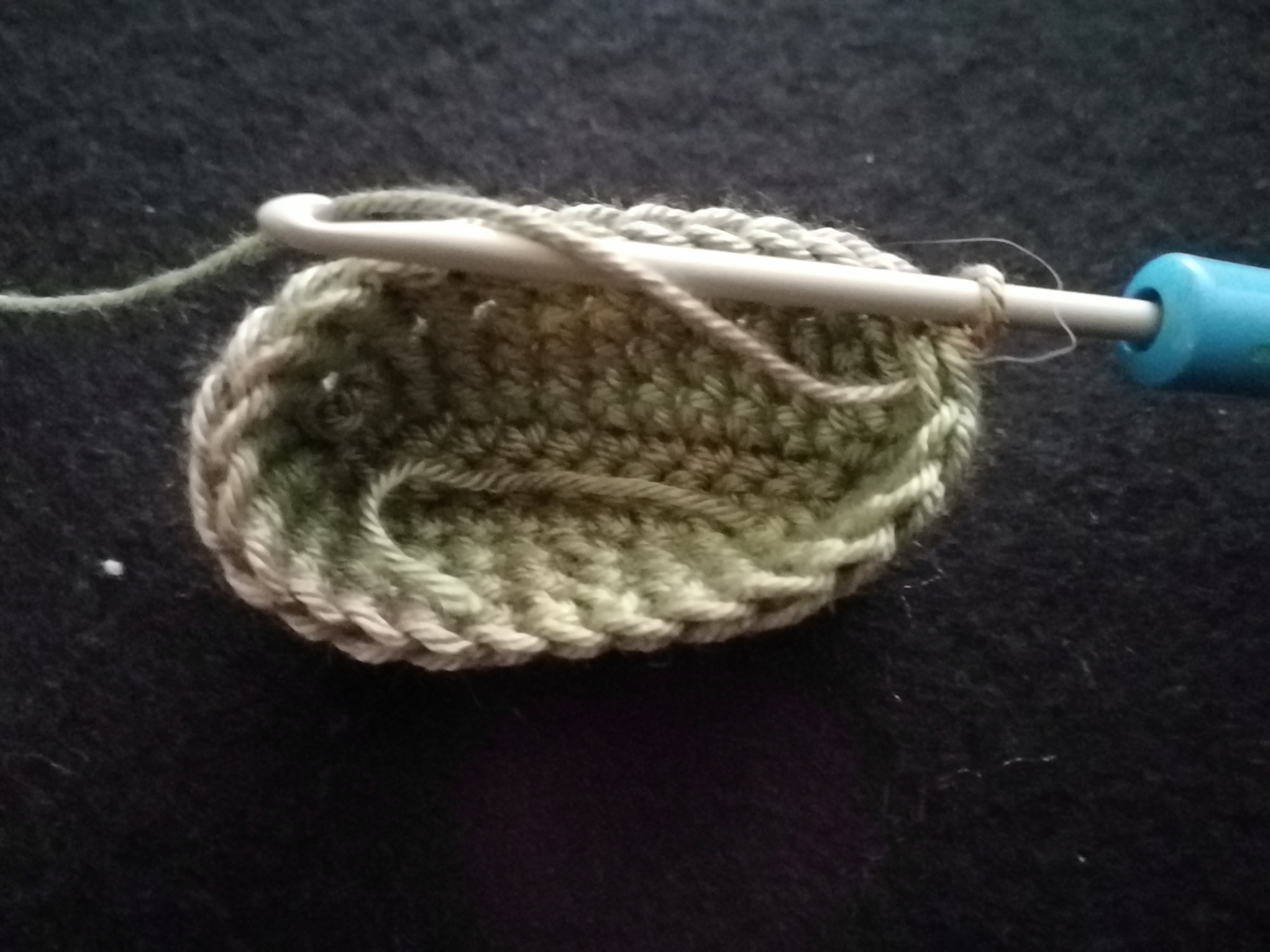 Háčikom 2,5 uháčkujeme retiazku z 12 očiek príslušne hrubej bavlny. Plus jedno očko navyše, aby sme mohli prejsť do druhého radu. Takto uháčkujeme štyri rady krátkymi stĺpikmi. Potom háčkujeme dookola v každom očku jeden krátky stĺpik a háčkovanie sa nám začne vyhýnať do tvaru misky ako môžeme vidieť na druhej fotografii.