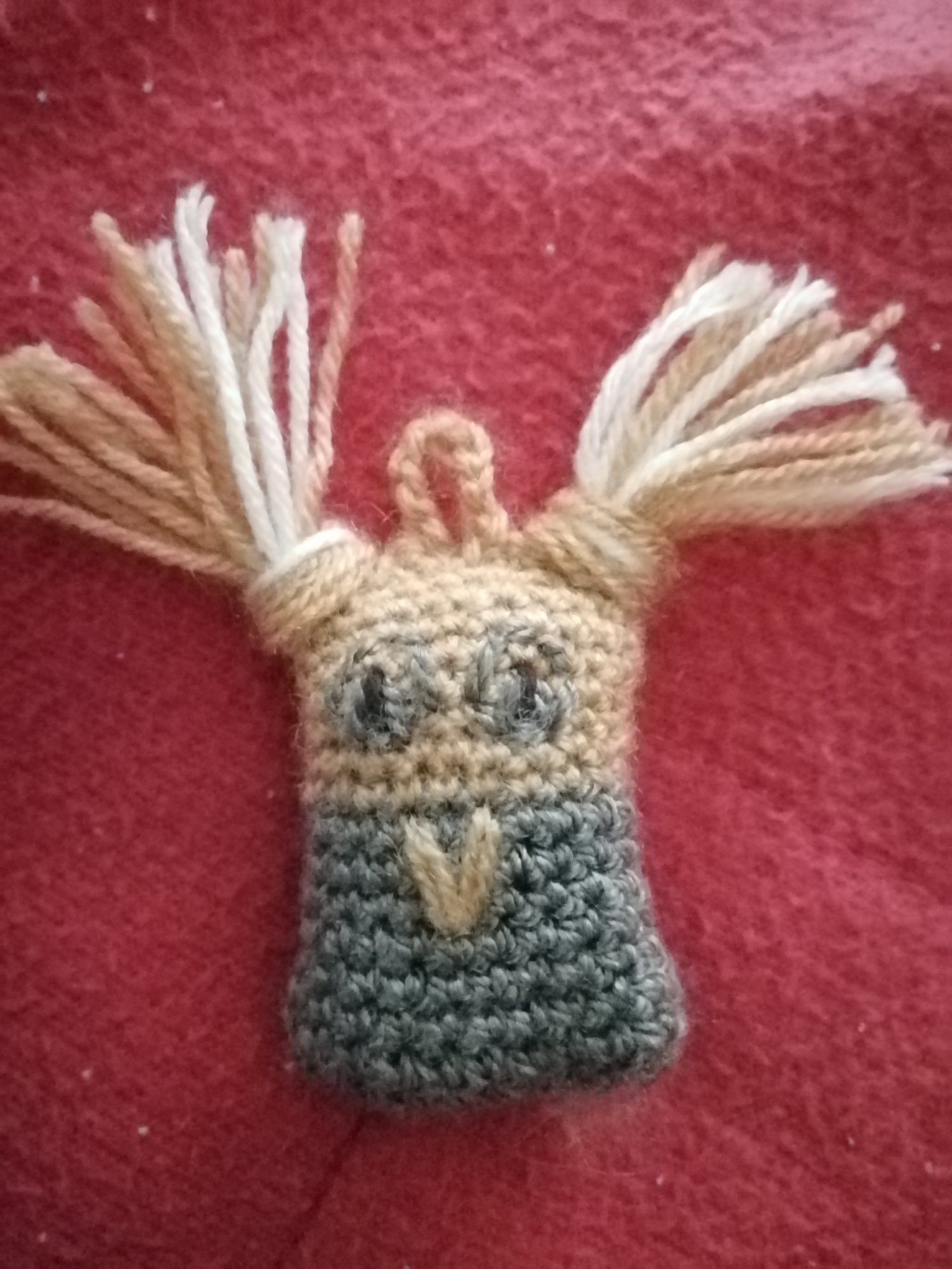 Háčkujeme do dvakrát vyššej výšky ako je šírka. Vyšijeme zobáčik a uši. Naplníme vankúšovou hmotou. Zháčkujeme, urobíme uško. Následne urobíme strapce na bokoch.