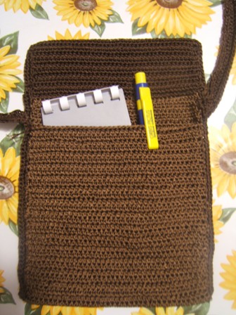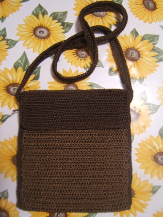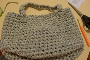 Nahodíme si 42 očiek. Uháčkujeme 50 radov dlhými stĺpikmi. Potom pás prehneme a krátkymi stĺpikmi sháčkujeme dohromady tak, aby sme vytvorili vrecko. Príklopku, ktorá z vrchu bude zakrývať tašku obháčkujem krátkymi stĺpikmi, aby sme upevnili okraj.