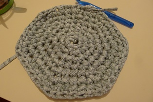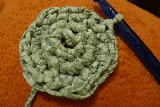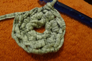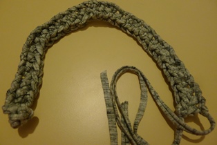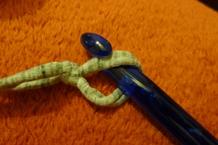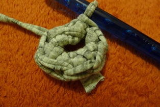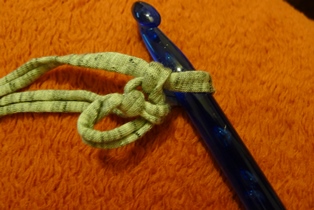 Budeme potrebovať tričkovinovú bavlnu hrúbky 1 cm a háčik veľkosti 6.