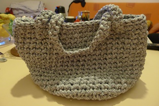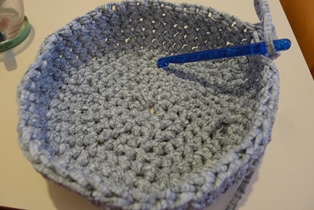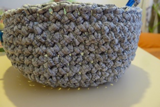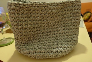 Niektoré háčkujeme z tričkoviny nastrihané na 1 cm široké pásy. Sú väčšie. Sú vynikajúcim darčekom každej žene. Doma ich používam na nahádzanie zbytkov pletenia alebo práve teraz mám v nej v obývačke pri kresle vložené klbká a ihlice, ktoré práve teraz požívam.