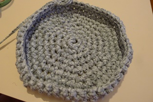 Ak už máme veľkosť dna s akou sme spokojné, háčkujeme okolo okruhy vždy v každom očku jeden krátky stĺpik. A zase do výšky akú chceme. Posledný rad uháčkujeme spevňujúcim radom.