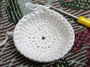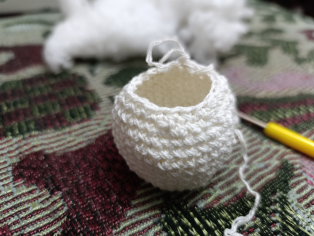 Následne háčkujeme desať okruhov bez pridávania očiek. Naplníme vankúšovou hmotou. Začne uzavierať guľu. V nasledujúcom okruhu zháčkujeme každé štvrté očko, V ďalšom každé tretie, v ďalšom každé druhé a nakoniec každé.