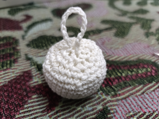 Uháčkujeme retiazku, ktorú prišijeme ku guli a vytvoríme uško na zavesenie gule.