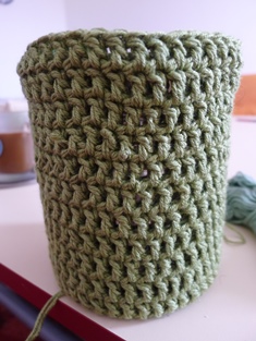 A teraz začneme robiť okruhy polodlhými stĺpikmi - v každom očku po jednom polodlhom stĺpiku až do výšky plechovky.