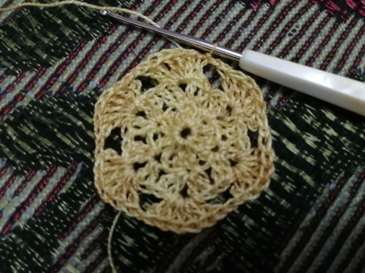 V nasledujúcom okruhu pomocou krátkych stĺpikov sa dostaneme do stredu prvej štvorice dlhých stĺpikov z predošlého okruhu. V tomto očku urobíme štyri dlhé stĺpiky, aby sme sa dostali do výšky okruhu. Následne v tomto očku urobíme päť dlhých stĺpikov. Potom v každom prostrednom očku zo štvorice očiek z predošlého okruhu urobíme šesť dlhých stĺpikov a okruh uzavrieme pevným okom.