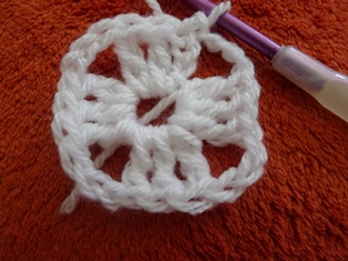 Urobíme si retiazku zo 6 očiek a pevným okom ju stiahneme do sľučky. V takto pripravenej sľučke urobíme najprv 3 retiazkové očká a 2 dlhé stĺpiky, potom 3 retiazkové očká, 3 dlhé stĺpiky, 3 retiazkové očká... ukončíme spojením pevným okom. Ako je na prvej fotografii.