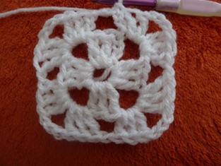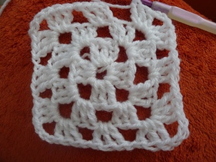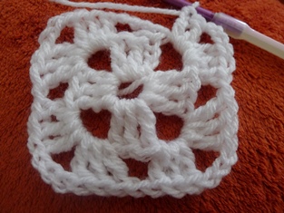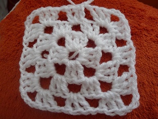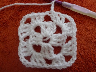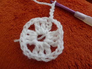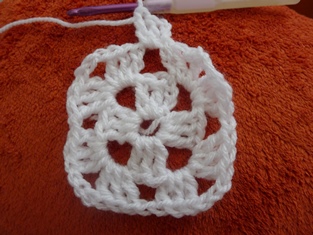 Na druhej fotografii si urobíme 4 retiazkové očká a začíname robiť druhý okruh. V troch retiazkových očkách z predošlého radu urobíme 3 dlhé stĺpiky, 3 retiazkové očká a zase 3 dlhé stĺpiky. Potom urobíme 1 retiazkové očko a v nasledujúcich troch retiazkových očkách z predošlého radu urobíme 3 dlhé stĺpiky, 3 retiazkové očká a... nakoniec okruh ukončíme ako vidieť na tretej a štvrtej fotografii.