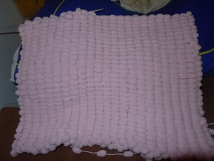 Nahodíme si na ihlicu 30 očiek tak, aby medzi každými dvomi „bombulami“ sme urobili jedno očko. Potom z každej strany pletieme tak, že medzi dvomi „bombulami“ urobíme jedno hladké očko. Tým pádom sa nám „bombuľky“ ukladajú pekne nad seba. Deka pôsobí riedko, ale je dosť teplá.