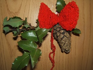 Vybrala som tenkú červenú vlnu s hrčkami. Na dvojkách ihliciach som si nahodila 40 očiek a plieta som pružným vzorom: hladko - obrátene 22 radov. Urobila som retiazku z 80 očiek. Retiazkou som omotala obdĺžnik (okolo osi dlhšej strany), aby som ho stiahla do tvaru mašle. Priviazala som retiazkou k vetvičke a vytvorila tam očko na zavesenie.