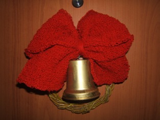 Vybrala som tenkú červenú vlnu s hrčkami. Na dvojkách ihliciach som si nahodila 40 očiek a plieta som všetky rady obrátene. Celá mašľa má dĺžku 80 cm. Potomsom z obdĺžnika vytvarovala mašľu, ktorú som v strede stiahla niekoľkokrát omotanou vlnou. Vzadu som vlnu zviazala, prviazala k stočenej vŕbe do kruhu a vytvorila uško na zavesenie celého venca.