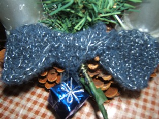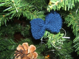 Vybrala som modrú bavlnu - hladkú - bez hrčiek. Nahodila som si na ihlicu č. 3 šestnásť očiek. Uplietla som 36 radov obrátene. Potom som pomocou bavlny stiahla obdĺžnik podľa osi dlhšej strany do tvaru mašle.