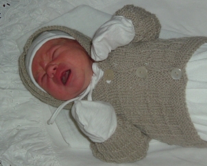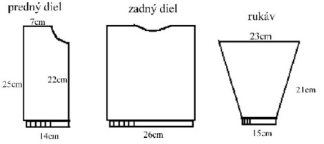 Na fotografií je dcéra 6-dňová (bola trochu dlhšia po narodení) v takom svetríku (šírku zmenšite na zadnom dieli na 24, šírku predných dielov zmenšite na 12, výšku predného dielu aj zadného skráťte na 22 cm a rukáv zmenšite len hornú šírku na 20 cm a skráťte na 18 cm ). Pri ukončovaní som však neurobila len osem riadkov hladko obrátene, ale som pokračovala vzorkou ešte 17 cm, ukončila rovno a hore zošila. Mala som pocit, že bude lepšie, ak bude mať lepšie zakrytú hlavičku, lebo sa narodila v októbri. Nič sa nestane, ak takémuto bábätku urobíte rukávy dlhšie, nebudete mu musieť dávať rukavičky, alebo schovávať ručičky, keď to nemá rado.