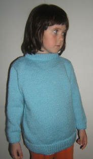 Nahodíme si na ihlicu 70 očiek. Pletieme systémom 2 očká obrátene a 2 očká hladko. Rubovú stranu ako sa javí. Pletieme do výšky 35 - 38 cm podľa dĺžky hrudníka dieťaťa. Potom v strede uzavriememe 16 očiek a dokončíme každú časť zvlášť. Pri dokončovaní častí od stredu postupne v jednotlivých riadkoch uzatvárame najprv 3 očká, potom 2, potom 1 a 1. Celý predný diel má máť po dokončení výšku 41 - 43 cm.
