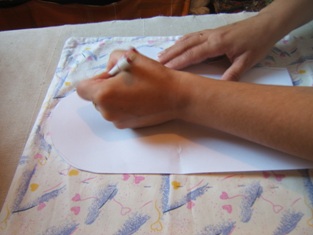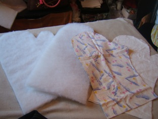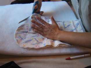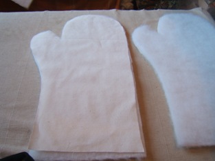 Obkreslíme si vystrihnutú šablónu na lícovú látku. Pozor, pridáme asi 1 cm na zašitie. Pozorne priložíme vystrihnutú rukavicu z lícovej látky ku rubovej látke a vystrihneme ešte raz. Rovnako urobíme aj z 2 cm hrubého vatelínu. Nezabudnite, vetky diely, musíte strihať dvakrát.