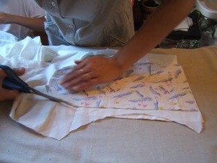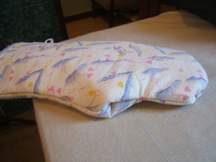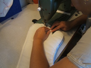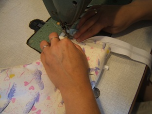Priložíme si jednotlivé diely k sebe. Na spodok dáme rubovú látku, potom vatelín, potom lícovú látku. Dostaneme akoby dva látkové hamburgery. Každý "hamburger" preijeme na šírku patky stroja a obendlujeme. Obstrihneme pretŕčajúce nitky a vatelín.