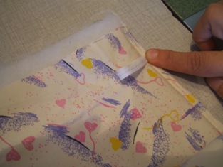 Najprv si hornú časť zošijeme na šírku patky, potom obšijeme širokým šikmým pásikom.